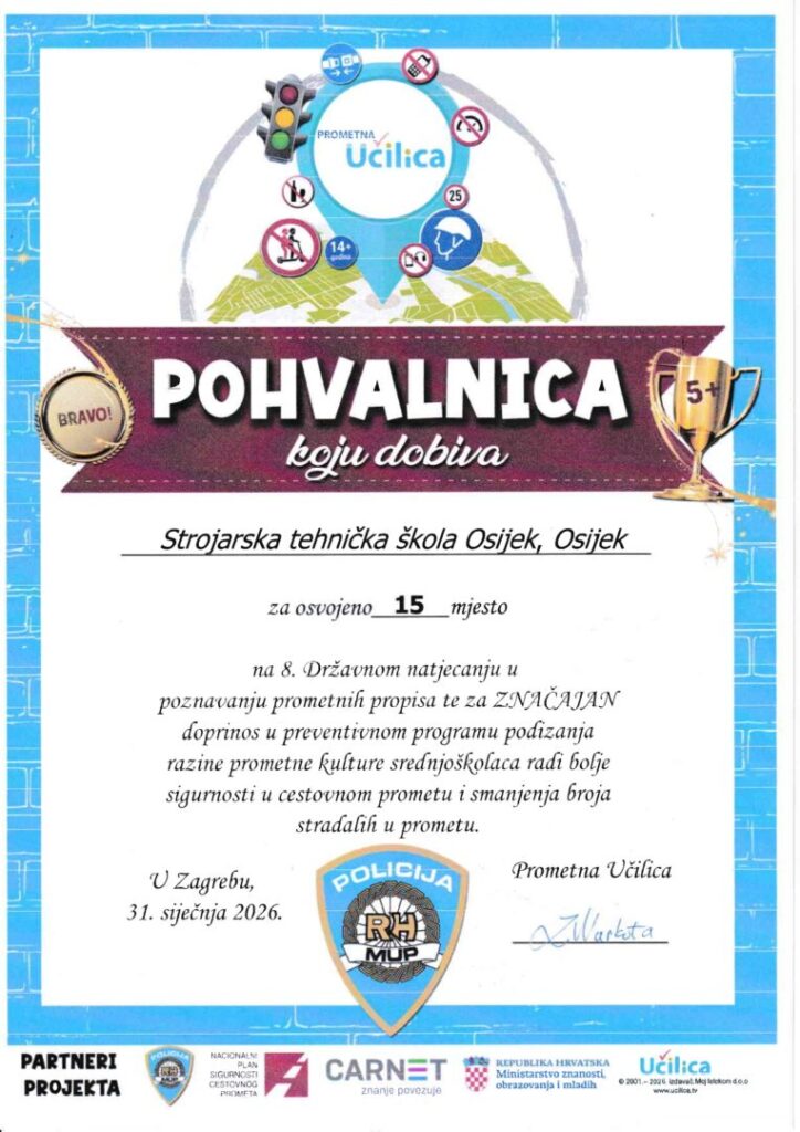 Navedenu aktivnost u školi vodi pedagoginja Suzan Berecki, a uz podšku nastavnika Mate Nadarevića učenik LEONARD Đanković budući automehaničar iz 3.S3 razreda dobio je pohvalicu za ostvarene rezultate na natjecanju!